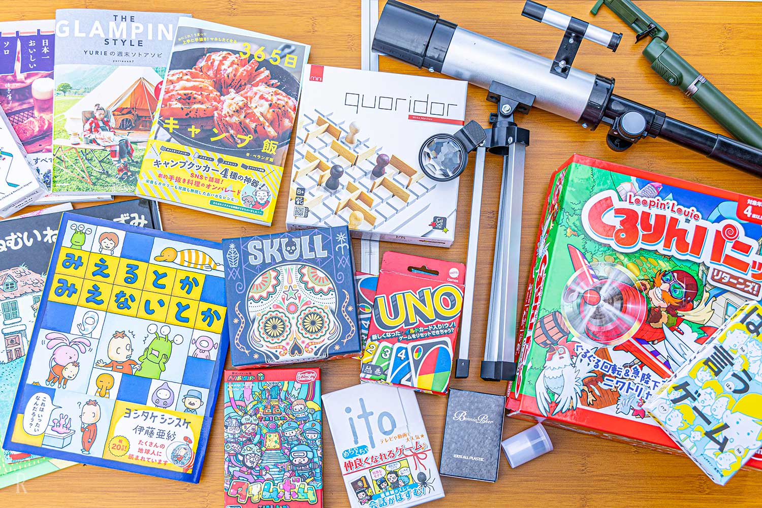 スマホ撮影スタンド、スマホ撮影用レンズ(広角・魚眼)、折りたたみ椅子、トランプ、UNO、ジェンガ、ボードゲーム各種、双眼鏡、星座早見盤 、花火用消化バケツ(流し台)